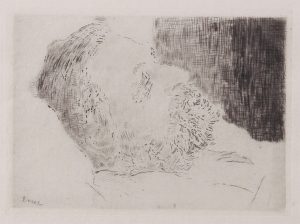 Pointe-sèche sur cuivre, biseaux, 9,2 x 13,1 sur Japon fin (marge visible : 12 x 16). 3ème état sur 3 (avec le trait échappé à l’épaule -Taevernier 35). En très belle condition. Sous verre et passepartout à biseau doré, dans un cadre orné doré.