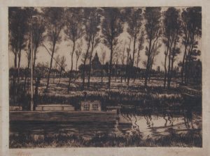 Gravure, 49 x 65. Epreuve sur Arches 56 x 61. Signée et datée «A. Oleffe. Nieuport, 1907» au crayon rouge en bas. Papier bruni. Sous verre, encadrée. □ Joint : Auguste OLEFFE. Barques (soir). Eau-forte, 49,5 x 65.5. Epreuve sur Arches 60 x 79.5. Titrée et signée «A. Oleffe. 1922» au crayon rouge en dessous. Marges brunies. Sous verre, cadre orné noir et doré.