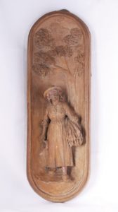 Bas-relief en terre cuite, 38,5 x 12,5. Signée «Bouet» dans le bas à droite. En belle condition. Sculpteur né à Caen dans le Calvados, sociétaire des Artistes Français, auteur notamment de bustes, monuments de la guerre 1914-1918, etc. (Bénézit). Sujet : une jeune paysanne, la serpe et une gerbe dans les mains, un arbre à l’arrière-plan.