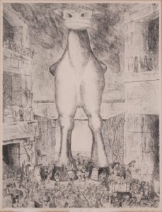 Eau-forte, 64 x 49. Epreuve sur Arches, marges. Titrée «Le Cheval de Troie», et signée et datée «Jean Dols. 1935» au crayon en dessous. En très bonne condition. Sous verre et passepartout, cadre gris à biseau doré. Importante estampe du grand graveur liégeois, inconnue de tous les répertoires.