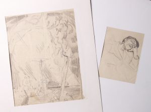 Signé et daté «Jean Donnay. 1921» en bas à gauche. Frais. Sous passe-partout. □ Joint : Jean DONNAY. Portrait d’homme. 1924. Dessin au fusain, 39 x 27. Signé et daté «Jean Donnay. 1924» en bas à gauche. Frais. Il s’agit peut-être du père de l’artiste. Joint : Jean DONNAY. Portrait de femme. 1977. Dessin aux crayons de couleurs, 31 x 29. Signé et daté «Jean Donnay. 1977» en bas. Frais. Sous passepartout. Il s’agit peut-être de l’épouse de l’artiste. Joint : Jean DONNAY. L’Ouragan. Dessin à la plume et lavis, 39 x 31. Titré au crayon. Sous passe-partout. Scène du calvaire.