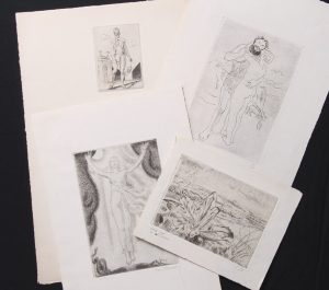 Eau-forte, 14 x 10,5. Premier état. Titrée et signée au crayon. Très fraiche. Sous passe-partout. □ Joint : J. DONNAY. 11 gravures. En belle condition.