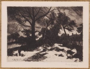 Eau-forte, 16 x 22. Marges. Signée dans la plaque en bas à gauche, et au crayon en dessous à droite. Très fraiche. Sous verre et passe-partout, dans une baguette d’acajou.