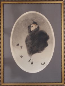 Estampe ovale 51 x 36,5. Signée »Louis Icart» au crayon en bas à droite. «Publié par L’Estampe Moderne Rue de Richelieu. 1924», imprimé, et numéro «254» au crayon. De très grande fraicheur. Sous verre et passepartout, cadre doré. Sujet : jeune belle en manteau de fourrure prise dans une giboulée avec de petits oiseaux.
