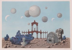 Lithographie en couleurs, 53 x 75. Justifiée «62 / 100» et signée «G. Bogaert» au crayon en dessous. Très fraiche. Sous verre, baguette noire. Peintre surrealiste et graveur, architecte, né au Mans (France) en 1918 et mort en 2008 (Arto). Sujet : Portique antique et fragments de statues.