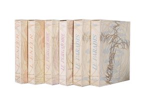 Paris, Les Heures Claires, 1963. 6 vol. in-folio (34 x 27), en feuilles sous couverture et emboitage d’éditeur. Illustré de 100 lithographies en compositions en couleurs de Salvador Dali à pleine page gravées sur bois et tirées en couleurs par M. Jacquet. Imprimé sur fort vélin pur chiffon de Rives. Exemplaire de l’édition originale, de grande fraicheur. Ce célèbre et important ouvrage fut commandé en 1957 par le gouvernement italien afin de célébrer le 700ème anniversaire de la naissance du grand poète Dante Alighieri.