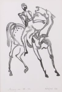 Lithographie en noir, 29 x 19,5. Epreuve sur Arches. Titrée et justifiée «‘Hsiung-nu. IV’ e / a», et signée et datée «Rik Poot. 1984» au crayon dans le bas. Très fraiche. Sous verre et passepartout, baguette noire. Sculpteur néo-impressionniste et dessinateur né à Vilvorde en 1924 et mort en 2006 (Arto). □ Joint : Rik POOT. Taureau. Impression, 21 x 29,5. Signée «Rik Poot» au crayon en bas au milieu. Sous verre et passepartout, baguette noire.