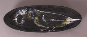 Plat en faïence de Dour. Longueur : 63 cm. ffiuvre signée «Somville» en dessous, et dédicacée «à Francine» à l’encre rouge. En très belle condition. On joint une photographie (polaroïd) présentant l’artiste et la dédicataire. Peintre, dessinateur, lithographe, créateur de tapisseries et de céramiques, auteur de fresques, né à Schaerbeek en 1923 et mort en 2014 (Arto).