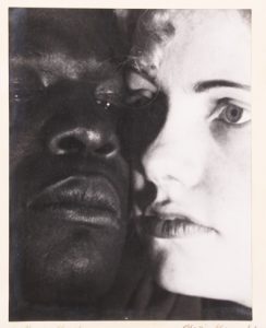 Photographie originale. Tirage argentique 29,5 x 23. Sous verre et passe-partout d’origine, baguette noire. Titrée, signée et datée «Erwin Blumenfeld. Amsterdam XXXIX» à l’encre sur le passe-partout. En belle condition. Photographe allemand naturalisé américain, né à Berlin le 26 janvier 1897 et mort à Rome le 4 juillet 1969. Il participa au mouvement Dada sous le pseudonyme «Jan Bloomfield», puis devint photographe professionnel aux Pays-Bas début des années ‘30. Photographe à Vogue France, il est interné dans un camp en raison de son origine allemande, mais s’enfuit avec sa famille aux Etats-Unis l’année suivante. Il y devint célèbre dans la photographie de mode et mène une très brillante carrière. Sujet de la photo : deux visages, d’homme noir et de femme blanche, accolés.