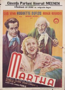 Affiche lithographiée en couleurs, 84 x 61. Signature et date «Emair. 1936» dans le bas à droite. Imp. L.F. De Vos & C° Anvers-Bruxelles (Belgique). Timbres fiscaux près de la marge supérieure, sous ma mention «Cinéma parlant» (bilingue F/NL). Petites taches maginales et perforations (traces de punaise dans la marge, et quelques minimes petis trous dans le sujet), sinon en bonne condition. Parmi les travaux publicitaires de ses débuts, Magritte produisit des affiches de cinéma. Le film vanté s’inspirait de l’opéra-comique de Flotow et fut réalisé par Charles Anton avec en vedette Huguette Duplos. Cet film sonore avait été produit par la société Tobis.