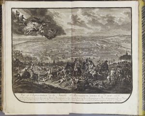 ‘s Gravenhaage, Isaac Vander Kloot, 1729. (Histoire militaire du prince Eugène de Savoie, du duc de Marborough, et du prince d’Orange-Nassau). □ 2 parties en deux vol. grand in-folio (54 x 33,5), demi-veau postérieur, faux-titre, page de titre imprimée en rouge et noir, 1 f. (table)-lxiii-147 p., et page de titre imprimée en rouge et noir, 1 f. (avis au relieur)-358 p. Illustration : le premier volume comprend 31 planches sur les 75 mentionnées à l’avis au relieur (une partie des planches, détachées; une : la bataille d’Oudenarde, a été amputée de la partie gauche marge inférieure, et a été réparée dans le haut à droite); au second volume, ne manquent que 4 planches (les plans d’Anvers et Bruges, et celui de Dendermonde et le portrait du prince Eugène), la grande planche (150 cm) du bombardement de Gueldre au mois d’octobre 1703, est présente. Reliure frottée, coiifes abimées et mors ém., intérieur généralement en bonne condition. Intéressant exemplaire de ce magistral ouvrage.