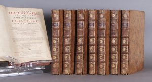 Amsterdam, chez Brunel, Wetstein, Veuve de Coup, Kuyper, L’Honoré et fils, Humbert, Chatelain, Uytwerf, Changuion, Wetstein et Smith, Mortier, et Catuffe; Leyden, Luchtmans et Haak; La Haye, Gosse, van Duren, Neaulme, Moetjens, Block, et van Dole, Utrecht, Neaulme, 1740. □ 8 vol. in-folio (40,5 x 25), plein veau de l’époque, dos à 6 nerfs, compartiments ornés, pièce de titre maroquin bordeaux, tranches rouges. Coins ém., coiffes et mors abimés et petits défauts à la reliure (aisément restaurable). Intérieur frais. Moréri publia son premier dictionnaire (en un seul volume, en 1674) en réaction à celui de Pierre Bayle. Il s’agit de l’édition la plus complète de son dictionnaire, réalisée par le sieur Platel, incluant le premier supplément de Goujet, et additionnée de nombreux articles nouveaux.