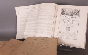 Paris, Firmin Didot Frères, Fils et Cie, Imprimeurs de l’Institut, Libraires, 1865-1868, 1884 (table générale). □ 27 volumes (livraisons, dont une pour la table générale) in-folio (35 x 26), broché. Ouvrage complet. La table reprend les noms de familles citées ou celles dont les généalogies sont insérées dans les six registres de 1738-1768. Une partie des volumes ont le dos fendu ou les cahiers relâchés; on constate des manques à des plats, une livraison (la 5ème) présente le dos et les gardes réparés, le premier plat manque à une autre (la 7ème). Intérieur frais. Source fondamentale pour l’étude de l’héraldique et de la généalogie nobiliaire françaises.