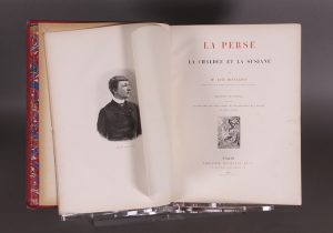 Paris, Librairie Hachette et Cie, 1887. □ In-folio (34,5 x 25,5), cartonnage d’éditeur rouge à décor d’inspiration persane, tranches dorées, 739 p. Abondamment illustré de gravures. Usures aux coiffes, mors et coins. Belle gouttière. Intérieur frais. L’auteur, épouse de l’archéologue Marcel Dieulafoy, a vu son nom associé à la résurrection de Suse, la glorieuse rivale de Ninive. La relation de voyage commence à Erevan en Arménie.