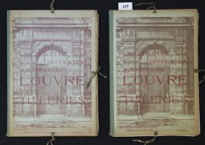 Paris, Librairies-Imprimeries Réunies, s. d. □ 2 vol. in-folio (52 x 36), en feuilles sous couvertures et portefeuille à lacets d’éditeur, 128 planches réparties dans 10 fardes. Bon exemplaire de cet ouvrage présentant par la photographie le plus imposant des palais parisiens.