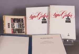 Paris, Arts et Métiers du Livre, 1947. □ In-4 broché, couverture rempliée, 168 p. Abondamment illustré. Dos réparé.^ Joint : HOFFMANN (Herbert), dir. Alphabets. Avec 80 planches. Edition de la Revue Arts et Métiers du Livre, s. d. En feuilles sous emboitage d’éditeur (l’emboitage, solarisé). Intérieur très frais. Joint : Le Type Book de typoGabor 86. Paris, Photocomposition, 1986. 2 vol. in-folio, en cartonnage illustré. Illustré de tous les types de styles typographiques. Bon exemplaire.