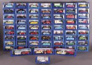 Collection complète des «petites boites» (64 véhicules simples), et 3 «grandes boites» (véhicules avec remorque: L’Ile noire, Le Crabe aux pinces d’or, L’Affaire Tournesol), sur 6, soit 67 sur 70 pièces en parfait état (quelques petites pliures à des boitiers).
