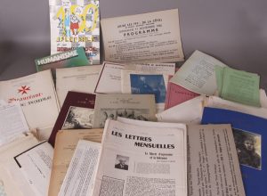 Important ensemble (majoritairement belge) de lettres, circulaires, programmes, revues, études, fascicules, invitations, affichettes, brochures, rapports, discours, etc. (certains documents en plusieurs exemplaires), dont un manuscrit original : rapport autographe de la séance d’intronisation d’un nouveau frère dans la franc-maçonnerie, 16 pages d’un cahier «écolier». Ensemble en belle condition.