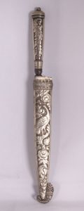 Longueur : 34,5 cm. Lame : 22 cm. Fourreau : 23 cm. Manche et fourreau ciselés avec des motifs floraux, une corne d’abondance et deux oiseaux. Lame ornée d’un décor doré. Légère oxydation de la lame.
