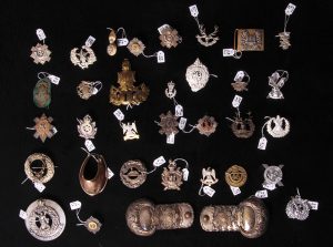 [GRANDE-BRETAGNE]. Lot de 31 pièces : badges, broches, insignes de col, hausse-col 1796-1830, épaulettes en cuivre c. 1845, etc.