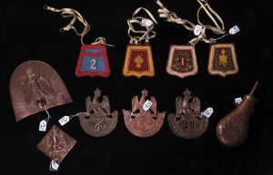 [DIVERS]. 4 réduction de sabretaches (10 x 9 cm, en tissu, galon,...); 6 plaques de shako, bonnet, etc.