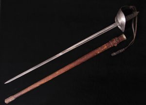 Longueur du sabre : 98. Lame : 82 cm. Fourreau (en bois recouvert de cuir, bague de métal) : 86 cm. Lame droite. Poignée en «peau de requin». Sabre offert par la GrandeBretagne à l’armée belge au début de la Première guerre mondiale. Identique à ceux de l’armée anglaise excepté la gravure sur la coquille, présentant les initiales A(lbertus) R(ex), et la couronne royale belge (au lieu de la couronne britannique et les initiales du roi George V. Seules quelques centaines d’exemplaires furent utilisés, jusqu’à ce que la France en fournit d’autres, plus proches du modèle belge. Le fourreau présente une gaine, cousue par les services de l’armée belge, chargée de maintenir un anneau permettant de fixer le fourreau à l’uniforme belge (dans le cas présent, l’anneau est absent). Le sabre est pourvu d’une dragonne belge. Ensemble en belle condition.