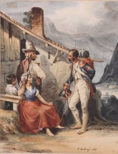 [Ecole française]. Hippolyte BELLANGE. Ier Empire. Soldat de la Grande Armée en conversation avec un couple d’Espagnols. 1828.