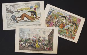 Estampe en couleurs, eau-forte, 43,5 x 30. Marges : 48,5 x 34. En-dessous, «Boilly Pinxit», «Levachez Sculpt», titrée, «Déposé à la Bibliothèque Nle le 29 thermidor an X», «A Paris, chez Auber Editeur Rue St Lazare Chaussée d’Antin n° 8», et «Duplessis Bertaux aquaforti». Boilly, peintre et graveur, né à La Bassée (Nord), en France, en 1761, et mort à Paris en 1845. Fils d’un sculpteur sur bois qui fut son seul professeur, il devint rapidement célèbre très jeune. Ses sujets étaient popularisés par la gravure (Bénézit). □ Joint : James GILLRAY (1757-1815), caricaturiste anglais. 3 caricatures en couleurs de 1813. Dimensions 26 x 41). Titres : The Oath of Allegiance to the Infant King f Rome; The Corsican Bloodhound, beset by the Bears of Russia; Nap’s Heroes or a Specimen of French Mercy and Moderation. En très belle condition.