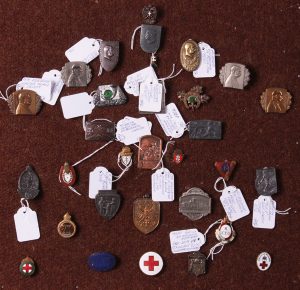 Pièces montées sur un morceau de feutre brun 38 x 39. Il y a notamment des insignes patriotiques austro-hongrois de la Première Guerre mondiale (médailles achetées afin de contribuer à l’effort de guerre). Ensemble en très belle condition. □ Joint : 13 soldats prussiens en plomb. Montés sur une plaquette. Joint : Deux auto-mitrailleuses miniatures. Tole peinte. Une pourvue de la clé pour la remonter. Joint : Tank-encrier «Souvenir de Verdun». Métal. Il s’agit d’un F 17 Renault.