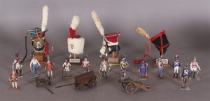 Ronde-bosse. Hauteur : 60 mm. 4 ancien régime, 9 XIXème siècle. Joint : 4 répliques de coiffures militaires Premier Empire. Hauteur : 5 cm., un canon (métal bois), et un chariot (idem). Ensemble en belle condition.