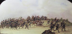Chasseurs à pied belges marchant à l’assaut à la bataille de Waterloo. 18 juin 1815.