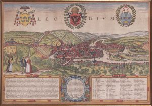 Vue gravée en coloris d’époque, 33 x 47. Avec l’inscription dans un médaillon «Civitatis Leodiensis genuina delineatio»... Vue prise des hauteurs de Saint-Gilles. En très belle condition. Reproduite dans Eugène Wahle, Liège dans la gravure ancienne et moderne, p. 21-23. Bel exemplaire en beaux coloris d’une des vues les plus célèbres de Liège. Sous verre et passepartout à biseau doré, cadre acajou.