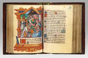 Parchemin. 158 ff., 57 x 39 mm (justification 38 x 28 mm). 19 longues lignes par page (calendrier y compris). Réglure d’une encre rousse. Composition. Un bifeuillet papier, dont le premier fol. est la contregarde sup. ; 158 ff. en parchemin (f. 1-3v° : blancs à l’origine, portent des mentions d’appartenance ; f. 14v°-15v°, 76r°v°, 84v° et 151v°-158v° : blancs) ; un bifeuillet papier, dont les 2 premiers fol. sont chiffrés « 159 » et « 160 », et le dernier constitue la contregarde inf. - F. 158 est amputé de son tiers sup. Veau fauve, filets, motif central avec attributs de la Passion, dos orné, tranches dorées (Reliure moderne). Texte. f. 4-14 : Calendrier discontinu. f. 16-24 : Les évangiles. f. 24 : S’ensuit l’oraison de sainct Charlemaigne. Oratio. Domine Iesu Christe, pastor bone conserva iustos, parce peccatoribus, requiem dona cunctis defunctis fidelibus nunc et in hora mortis semper et ubicumque nobis esto propicius. Amen. Nota. Loraison charlemaigne se trouve couramment dans les livres d’heures parisiens imprimés dès les années 1490. f. 25-75v° : Heures de la Vierge, selon l’usage de Rome. f. 77-80 : Heures de la Croix. f. 80v-84 : Heures du Saint-Esprit. f. 85-103 : Psaumes de la pénitence, avec litanies (f. 95v°-100). f. 103-139 : Ad vesperas mortuorum : Office des morts, selon l’usage de Rome. f. 139v-151 : Suffrages. Nota. Aucun élément ne permet de localiser ce manuscrit. On cherchera en vain quelque indication utilisable dans le calendrier, les litanies, et les suffrages. Décoration. Ces heures sont dotées d’une décoration étonnamment riche pour un manuscrit aussi petit. Elles comprennent 32 peintures : 14 miniatures en pleine page et 18 petites (15 x 15 mm). Apparemment, le programme iconographique développé est ici sans surprise (on notera toutefois que La Visitation est seulement l’objet d’une petite peinture), mais deux miniatures se distinguent par leur rareté dans les manuscrits de ce type : Le Jardin des Oliviers et Adam et Ève tentés par le serpent. Remarquable est l’association de cette dernière avec une Annonciation (f. 24v°-25). Le thème des grandes peintures est le suivant : Les peintures à pleine page sont inscrites dans un encadrement architectural doré de type Renaissance englobant la plupart du temps les premières lignes du texte (de 2 à 6 lignes). Fait exceptionnel, l’une d’elles (L’Annonce aux bergers) englobe les deux dernières lignes de l’heure précédente, si bien que la peinture se trouve encadrée de texte ; en revanche, aucun texte ne figure sur les peintures d’Adam et Ève, du Couronnement de la Vierge et de David. Rares sont les scènes d’intérieur (La Présentation au Temple et la Pentecôte). Hormis le Couronnement de la Vierge, scène nimbée dans un nuage bleu ciel, les scènes sont inscrites dans des paysages lointains qui peuvent être vraiment beaux (Saint Jean à Patmos et la rivière qui serpente entre des montagnes surmontées de puissantes murailles, David agenouillé à l’entrée de son palais, une ville lointaine barrant la perspective, etc.). Autant de traits qui donnent à ces minuscules peintures une étonnante respiration. Le premier plan est toujours occupé par les personnages, aux visages calmes et recueillis. Les habits sont le plus souvent blancs et les plis sont soulignés d’un trait de couleur pâle. Le traitement des petites peintures est uniforme. Son auteur se concentre sur le haut du corps de son sujet, et l’accompagne de son symbole. La précision du « récit » qu’implique le thème développé est parfois d’une précision d’autant plus stupéfiante que la dimension de l’illustration est réduite. La petite image de saint Roch (f. 145v°) l’illustre fort bien : dans une forêt, le saint est réconforté par un ange et ravitaillé par un chien. On reconnaît saint Roch († 1379) au bâton qu’il tient à la main, à son chapeau à larges bords et à sa cape de pèlerin dont il relève un pan pour faire voir la plaie qu’il a à la jambe. Un ange et un chien se tiennent à ses côtés, car Roch, atteint de la peste, s’était retiré dans une forêt pour ne pas infecter les autres ; seul un chien venait le nourrir en lui apportant chaque jour un pain dérobé : c’est pourquoi saint Roch est représenté avec son chien (saint Roquet, d’où le terme de « roquet » pour désigner un chien). Il a été à Paris l’objet d’une fête solennelle et une église lui est dédiée (XVII e s.). 1) Saint Jean à Patmos (f. 16) : In illo tempore erat Verbum (Io 1,1). 2) Le Jardin des Oliviers (f. 22) : In illo tempore apprehendit Pilatus Iesum et flagellavit eum (Io, 19,1). 3) Adam et Ève tentés par le serpent à tête de femme au buste dévoilé (f. 24v°). 4) L’Annonciation (f. 25). 5) La Nativité (f. 43). 6) L’Annonce aux bergers (f. 47). 7) L’Adoration des mages (f. 50v°). 8) La Présentation au temple (f. 54). 9) La Fuite en Égypte (f. 57v°). 10) Le Couronnement de la Vierge (f. 64). 11) La Crucifixion (f. 77). 12) La Pentecôte (f. 81). 13) David priant (f. 85). 14) Job, sur son fumier, est visité par sa femme et ses amis (f. 103v°). Des initiales, de taille variable selon leurs fonctions, complètent l’ornementation de ce manuscrit ; elles sont peintes à l’or sur des fonds alternativement bleus et lie-de-vin. Le reste de la décoration consiste en bouts de ligne et rubriques. Provenance. La liturgie - romaine - ne permet pas de localiser l’origine de ce manuscrit. Deux indices pourraient nous inciter à voir une origine tourangelle : la présence de saint Roch au suffrage et Saint-Martin-le-Beau cité dans une marque d’appartenance, soit deux communes des environs de Tours, distantes de moins de trente kilomètres l’une de l’autre. Mais le caractère de la peinture semble bien parisien. « Ce petit livre apartien à moi François Le Faivre, de Sen-Martin Le Beau [Saint-Martin-le-Beau, Indre-e
