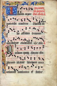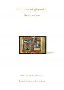 Parchemin. 72 ff., 305 x 205 mm (justification : 235 x 130/140). 21 longues lignes ou 7 portées par page. Réglure à l’encre brune. La justification peut varier selon qu’il s’agit d’une page de texte ou d’une page entièrement notée. Abondante notation musicale carrée sur portées à 4 lignes rouges, clés de sol, clés de fa, bémols (f. 14), guidons soigneusement indiqués. L’angle inférieur extérieur de quelques feuillets a été restauré. Composition. Garde, I 8 (f. 1-8), II8 (f. 9-16), III8 (f. 17-24), IV8 (f. 25-32), V8 (f. 33-40), VI8 (f. 41-48), VII8 (f. 49-56), VIII8 (f. 57-64), IX2 2 feuillets libres (f. 69-70), X3 (4—1) le premier feuillet du cahier a été coupé (f. 71-73). Veau brun sur ais, décor estampé à froid de filets et de petits fers, dos à cinq nerfs (Reliure contemporaine du texte, restaurations). Décoration. La première page est décorée d’une jolie bordure à compartiments de motifs végétaux (feuilles d’acanthe, fleurs rouges) (f. 1). L’ensemble du manuscrit est décoré d’initiales ornées de deux sortes : 1) des initiales de couleur rehaussées à l’or, comme il est courant dans les manuscrits liturgiques parisiens de cette époque. 2) des initiales tracées à l’encre noire, fines et étirées vers le haut, d’un style qui provient des manuscrits juridiques. Elles sont employées à partir du XIV e siècle dans les manuscrits musicaux en raison de leur légèreté. L’AJOUT DE 52 REPRÉSENTATIONS DE TÊTES HUMAINES OU GROTESQUES DESSINÉES AVEC UNE PLUME TRÈS FINE ET JOLIMENT COLORIÉES DÉSIGNE LA FIN DU XVE SIÈCLE. Ces belles initiales interviennent dans les pièces notées sans alourdir l’aspect général. Texte. f. 1-7v : Vêpres de l’Invention de saint Sébastien. f. 8-18 : Messe de l’Invention de saint Sébastien, qui est célébré le 13 octobre (f. 7v°). - Annotation marginale : « Evangelium sancti Rochi invenies in fine libri » (f. 9. début XVI e s.), voir f. 73v. Nota. La présence de saint Roch dans ce corpus lié à la peste n’est pas insignifiante. Entre autres attributs (invocation contre la silicose des tailleurs de pierre, contre les maladies des animaux et de la vigne [le phylloxéra]), celui-ci pouvait être invoqué contre les épidémies de peste, de choléra, de typhus. f. 18-26v : Messe des défunts (CO 3116b-c, 2204, 2684a-b). f. 26v°-53 : Office des morts, selon l’usage parisien (cf. Ottosen, 72.14.32.57.24.68.28.46.38). f. 53v°-67 : Prières de la « commandatio defunctorum » (cf. CO 1251 : Missa in anniversario depositionis die). f. 67v°-70v : Gloria suivi du Credo. Les initiales sont absentes f. 70rv, mais espaces réservés au bas du f. 69v°, et f. 70 (D, F) et verso (I, F). f. 71-73v (d’une autre main, début XVI e s.) : Dies irae. f. 73v : Évangile selon Mathieu (cf. annotation marginale, f. 9). Provenance. Ce manuscrit a été exécuté à Paris à la fin du XV e siècle on ne sait pour qui, mais l’abondance de la musique laisse envisager qu’il a été commandité par un chantre. Adrien Martin, diacre de l’église Saint-Paul de Paris : « 1504 octobris 21, a magistro Adriano Martino, tum temporis diacono apud divum Paulum Parisiis » (f. 73v°). Jean Geoffroy, conseiller du roi, à Épernay : part i au I er d’argent à trois têtes de Maures de profil ; au 2e d’or à la croix de gueules (ex-libris gravé, écu dans un cartouche supporté par deux Maures). Et au-dessous : « Ex-libris Ioan. Geoffroy, Regi a conciliis. Sparnac. » (contre-garde sup.). Catalogue de la bibliothèque Georges Moreau, Paris, 1934, n°3. Bibliographie. P. PERDRIZET, Le Calendrier parisien à la fin du moyen âge d’après le bréviaire et les livres d’heures, Paris, 1933 (Publications de la faculté des lettres de l’université de Strasbourg, 63), p. 80-81. - K. OTTOSEN, The Responsories and Versicles of the Latin Office of the Dead, Aarhus, 1993. - CO = Corpus orationum, inchoante E. MOELLER †, subsequente I.M. CLEMENT †, totum opus perfecit B. COPPIETERS ‘T WALLANT †, 10 vol., Turnhout, 1992-1997 (Corpus Christianorum. Series Latina, CLX-CLX i). - Victor LEROQUAIS, Les Bréviaires manuscrits des bibliothèques publiques de France, 5 vol., Paris, 1934. - ID., Les Livres d’heures manuscrits de la Bibliothèque nationale, 2 vol., Paris, 1927. - Catalogue de la bibliothèque de M. Georges Moreau, ancien associé de la Librairie Larousse, vente [Paris, Hôtel Drouot] les 10, 11, 12, 13 décembre 1934, E. Giard, comm.-pris., G. Andrieux, expert. Paris, 1934, n° 3. UN MANUSCRIT RARE, TÉMOIN EXCEPTIONNEL DU TRAUMATISME CAUSÉ PAR LA PESTE SUR LA POPULATION À LA FIN DU MOYEN ÂGE. La Peste noire (1347-1352) ne fut ni la première ni la dernière des grandes épidémies du Moyen Âge mais, par son ampleur (décès en 5 ans de 40 à 50% de la population européenne, soit entre 15 et 20 millions d’individus), elle marqua profondément toute la société. On vit se multiplier des groupes de flagellants, tentant d’expier les péchés, avant la Parousie (retour glorieux du Christ à la fin des temps en vue de l’établissement définitif du royaume de Dieu), dont on pensait que la peste était un signe annonciateur. Ces groupes restaient toutefois marginaux, et la plupart des chrétiens firent face au fléau par une piété redoublée, mais ordinaire et encadrée par un clergé qui réprouvait les excès. L’iconographie de l’Apocalypse est alors bouleversée : elle figure à l’origine, comme le veut son étymologie, la « révélation », pour finir par évoquer une catastrophe massive et violente. C’est dans ce contexte que se développa le culte de saint Sébastien. Celui-ci mourut percé de flèches, or la peste était attribuée aux flèches de la colère divine. Sébastien pouvait donc préserver de la peste et, à la suite de la Peste noire, de nombreuses associations pieuses furent fondées dans le but d’obtenir l’intercession de ce saint pour lutte
