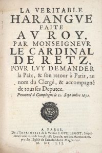 Le volume contient, entre autres : Remontrances faites au Roy et à la Reine régente, par Mr le président de Galliffet, député du département de Provence, pour le changement de gouverneur. Paris, Nicolas Bessin, 1651. Moreau, n°3340. Rare. — La Véritable harangue faite au Roy, par Monseigneur le cardinal de Retz, pour luy demander la paix et son retour à Paris, au nom du clergé, et accompagné de tous ses députez. Prononcé à Compiègne le 12 septembre 1652. Paris, Veuve J. Guillemot, 1652. Moreau, n°3937. — Harangue faite au Roy par Messieurs les députez du Corps de la noblesse, Monsieur de Nossey, portant la parole. Paris, Veuve J. Guillemot, 1652. Moreau, n°1593. Rare. Quelques mouillures claires. Reliure épidermée, petit manque en queue.