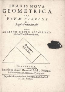 Metius (Adriaan). Praxis nova geometrica per usum circini et Regulae Proportionalis. Francfort, Ex officinâ Ulderici Dominici Balck [Amsterdam, Johannes Jansson], 1623. In-4, vélin souple de l'époque.
