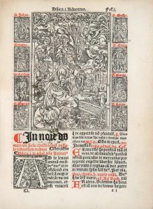 Très rare édition de ce missel de l’ordre des cisterciens, imprimée sur deux colonnes en rouge et noir, agrémentée de nombreuses lettrines et ornée d’une dizaine de bois de taille moyenne et de 5 grands bois dans le texte. Ex-libris manuscrit du XVIII e siècle d’origine catalane sur la première garde (Andrea Sorcano). Manque le feuillet l2 (f. 80). Déchirure avec petits manques de papier sur le bord du titre et à quelques feuillets, dont le dernier qui est en partie recollé sur une garde. Marge intérieure du titre en partie doublée, réparation en pied du feuillet h2. Doublure du contreplat inférieur et garde attenante renouvelées. Coins et deux coupes restaurés.