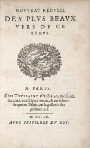 Nouveau Recueil Des Plus Beaux Vers De Ce Temps. Paris, Toussaint du Bray, 1609. In-8, vélin ivoire rigide, triple filet à froid, dos lisse portant le titre et la date en lettres capitales noires, tranches dorées (Bauzonnet).