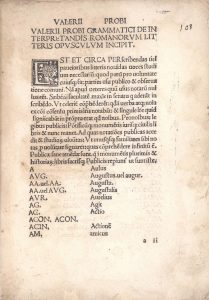 BMC, V, 534. — Essling, n°1179. — GW, M35529. — Proctor 5448. Troisième édition incunable de ce recueil renfermant des abréviations utilisées dans les textes officiels et historiques de l’Antiquité. Le grammairien et commentateur Marcus Valerius Probus, originaire de Beyrouth, vécut sous le règne de Néron. Manque le feuillet d2, qui contient au verso un bois représentant la Sibylle. Mouillures et fortes rousseurs.