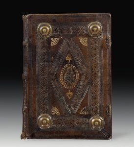 doré au centre représentant une Vierge à l’Enfant, entouré de deux fleurons, bouillons de laiton, restes de fermoirs de laiton en forme de coquille, dos à trois nerfs. Jolie reliure italienne du XVI e siècle. Les écoinçons dorés de ce style se retrouvent sur des reliures romaines ou vénitiennes. De Marinis ne reproduit cependant pas la roulette florale la plus caractéristique de cette reliure, celle qui dessine le losange. La reliure devait recouvrir un diplôme, ou un acte de quelques feuillets. De la bibliothèque Georges Moreau (1934, n°302). Manquent deux fermoirs, accrocs fragilisant les coiffes, quelques fers oxydés, taches ombres.