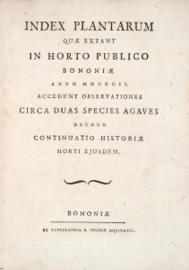 l’époque). Pritzel, n°7692. Édition originale de ce catalogue recensant de manière alphabétique plus de 2500 espèces de plantes qui croissent dans les jardins publics de Bologne. Elle est ornée de 5 planches, gravées sur cuivre sur 4 feuilles dépliantes. Cachet à l’encre rouge sur un contreplat.