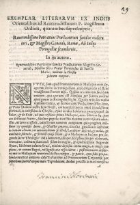 Santa Maria (Fernando de). Exemplar literarum ex Indiis Orientalibus ad Reverendissimum P. Magistrum […]. S.l.n.d. [au colophon] : Rome, Haeredes Antonii Bladii, 1571. Plaquette in-4 de 4 pp.n.ch., brochée, couverture de papier gris muette.