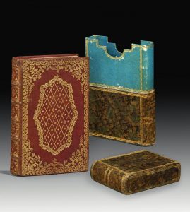 végétale en encadrement, fleurons et petits fers en écoinçons, grand cartouche central de forme octogonale dessiné aux petits fers, chargé d’un décor de croisillons et d’un semé de petites étoiles, dos orné, roulette sur les coupes, doublure de papier dominoté, tranches dorées, étui de basane marbrée (Reliure italienne de l’époque). Édition imprimée en rouge et noir, illustrée d’un frontispice, d’une vignette répétée sur les titres et de 14 figures à pleine page, le tout gravé en taille-douce par Antonio Gramignani et Niccolo Mogalli d’après Joseph Passarus, Andrea Bartolotti et Maratti. Très bel exemplaire, dans une élégante reliure italienne de l’époque, présentée dans son étui d’époque. Légères rousseurs. Petits frottements à la reliure.