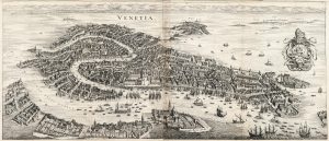 lisse portant le titre à l’encre en tête, tranches bleues (Reliure de l’époque). Première édition, rare, de cet important et beau livre sur la topographie de l’Italie composé par le géographe Martin Zeiler (1589-1661). Elle est illustrée d’un beau frontispice allégorique gravé en taille-douce par Joachim Sandrart, de 5 cartes géographiques dépliantes et de 38 planches doubles montrant des plans et des vues de différentes cités italiennes, finement gravées sur cuivre par Matthieu Merian. Les magnifiques et célèbres vues de Venise et de Rome, dépliantes (300 x 700 mm), sont bien présentes dans l’exemplaire. L’ouvrage est imprimé sur deux colonnes, le texte en allemand en caractères gothiques et les noms latins en caractères romains. Il porte la marque typographique de l’éditeur sur le titre. Exemplaire dans une reliure armoriée germanique, bien complet du dernier feuillet d’errata. Cachet humide sur le titre. Taches claires à quelques feuillets, papier légèrement roussi de manière uniforme, un trou de ver touchant le texte et les planches sur l’ensemble du volume, déchirure sans manques au feuillet liminaire **7. Coiffe de tête frottée avec la tranchefile en partie sectionnée, un morceau de vélin restauré en pied, une coupe ouverte.