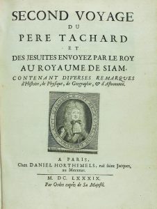 1689. (VIAJES-SIAM). TACHARD, GUY: SECOND VOYAGE DU PERE TACHARD ET DES JESUITES AU ROYAUME DE SIAM. Paris: Daniel Horthemels, 1689. 4º menor. 8 p. + 416 p., 10 p. 6 láminas plegadas de fauna y flora. Grabados en portada, viñeyas y capitales....