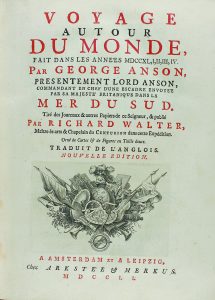 [Sigue:] Idem: VOYAGE DE LA MER DU SUD, FAIT PAR QUELQUES OFFICIERS COMMANDANTS, LE VAISSEAU DE WAGER. Pour servir de suite au Voyage de George Anson... Lyon: Imp. Frères Duplain, 1756. 2 h. XVI + 185 + XIV p. Enc. en plena piel de época. Hilos dorados en los planos y cantos. Ruedas en las guardas, cortes dorados. Nervios y lomo cuajado.