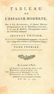 an Ve., 1797. 3 vol. en 4º. I: VII + 383 p. 1 mapa de España y 4 láminas (vistas del acueducto de Segovia y del Escorial, Plano de Madrid, y estatuas de Carlos V y Felipe IV); II: 390 p. y 2 láminas, que contienen 12 escenas de una corrida de toros; III: 362 p. + 1 h. y 4 láminas (Catedral de Sevilla, Plano de la Bahía de Cadiz, vista de Gibraltar y plano de su ataque, con Baterías flotantes, el 13 de Seiembre de 1782. Enc. en media piel. Palau 340556. Foulché. Delbosc 189.