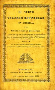 1832. (VIAJES-PERU). EL NUEVO VIAJERO UNIVERSAL EN AMERICA O SEA HISTORIA DE VIAJES AL PERU MODERNO. Barcelona: Imp. de A. Bergnes y Compañia, 1832. 8º. 120 p. Ilustr. con 2 grabados al cobre, colorados. Papel barbado. Rústica edit. Ejemplar...