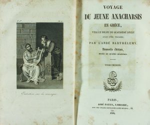 1838. (VIAGES CLASICOS). BARTHELEMY, ABBE [JEAN JACUQES]: VOYAGE DU JEUNE ANACHARSIS EN GRECE. París: Aimé Payen, 1838. 4 vols. en 8º. I: LXXX p. + 331 p., 2 h.; II: 2 h., 392 p.; III: 2 h., 396 p.; IV: 2 h., 412 p. Frontis grabados al acero....