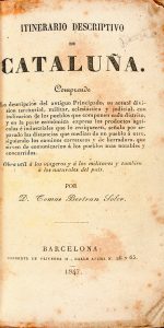 1847. (VIAJES). BERTRAN SOLER, TOMAS: ITINERARIO DESCRIPTIVO DE CATALUÑA ... obra útil a los viageros y a los militares y también a los naturales del país. Barcelona: Imp. Oliveres, 1847. 8º. 284 p., 1 h. Enc. en media pasta valenciana moderna,...